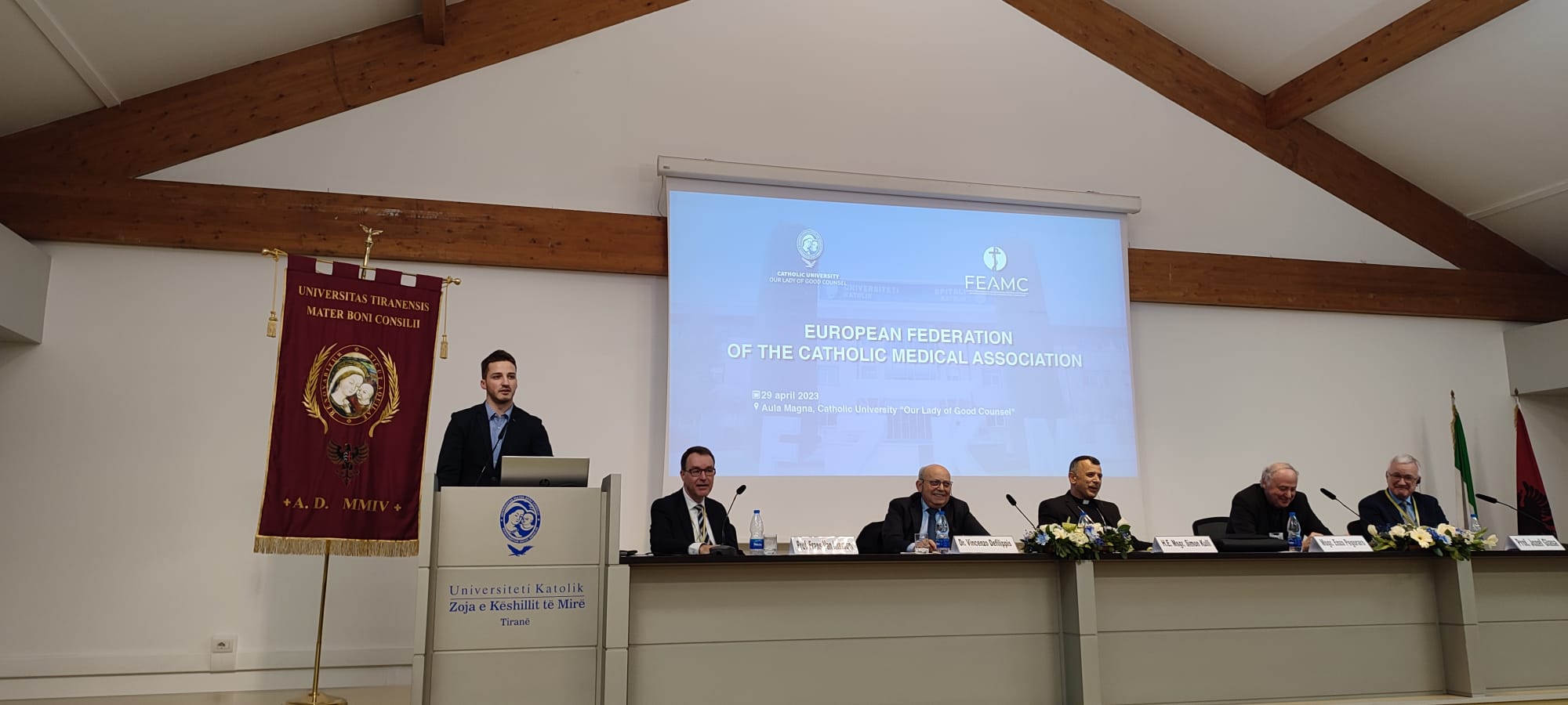 Prije našeg odredišta – Tirane – stali smo u gradu Lezhë gdje nam se pridružio vlč. Frano Čivljak, rođeni Dubrovčanin, rođaka našega Predsjednika te svećenik u lješkoj katedrali koji je u Albaniju dospio kao svećenik neokatekumenskog puta. Umjesto izlaganja, Frano je velikodušno prihvatio formu pitanja i odgovora te je odgovorio na sva naša pitanja o Albaniji koja smo u tom trenutku imali (barem pola pitanja bilo je o hrani). I tako smo u veselom tonu i polagano u gužvi tipičnoj za petak, ušli u Tiranu, glavni grad Albanije. Odjednom su zgrade postajale sve više i više, a nervoza predsjednika je bila sve veća i veća jer je morao stići na sastanak Upravnog odbora FEAMC-a. Dok je trajao sastanak, ostali članovi družine su se malo okrijepili prije večere. Cijeli Simpozij je inače organiziran u prostorijama Katoličkog sveučilišta Gospe Dobrog Savjeta u Tirani.