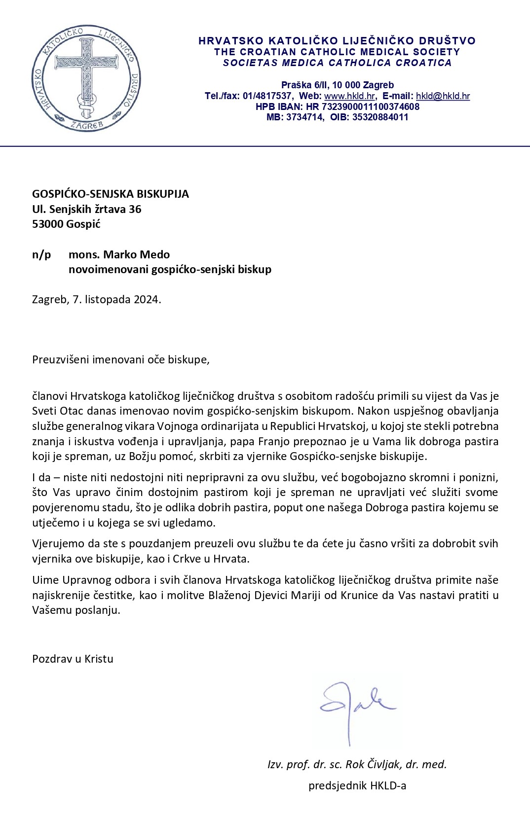 Predsjednik HKLD-a izv. prof. dr. sc. Rok Čivljak, dr. med., uputio je u ponedjeljak 7. listopada čestitku mons. Marku Medi na imenovanju novim gospićko-senjskim biskupom. Čestitku možete pogledati u cijelosti.